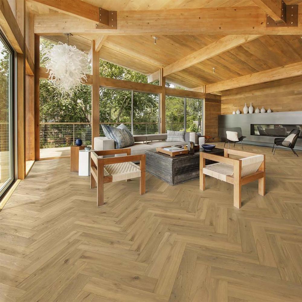 Kährs HERRINGBONE - pokládka do vzoru rybia kosť, 2-vrstvové parkety z prírodného dubu o hrúbke 11 mm.