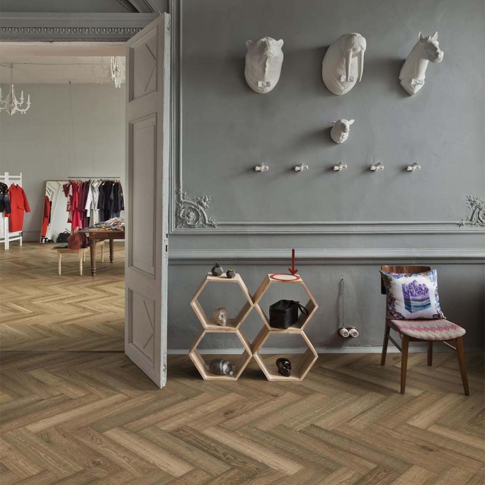 Kährs HERRINGBONE - pokládka do vzoru rybia kosť, 2-vrstvové parkety z prírodného dubu o hrúbke 11 mm.
