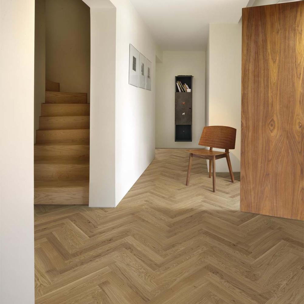 Kährs STUDIO HERRINGBONE - pokládka do vzoru rybia kosť, 2-vrstvové parkety z prírodného dubu o hrúbke 11 mm.