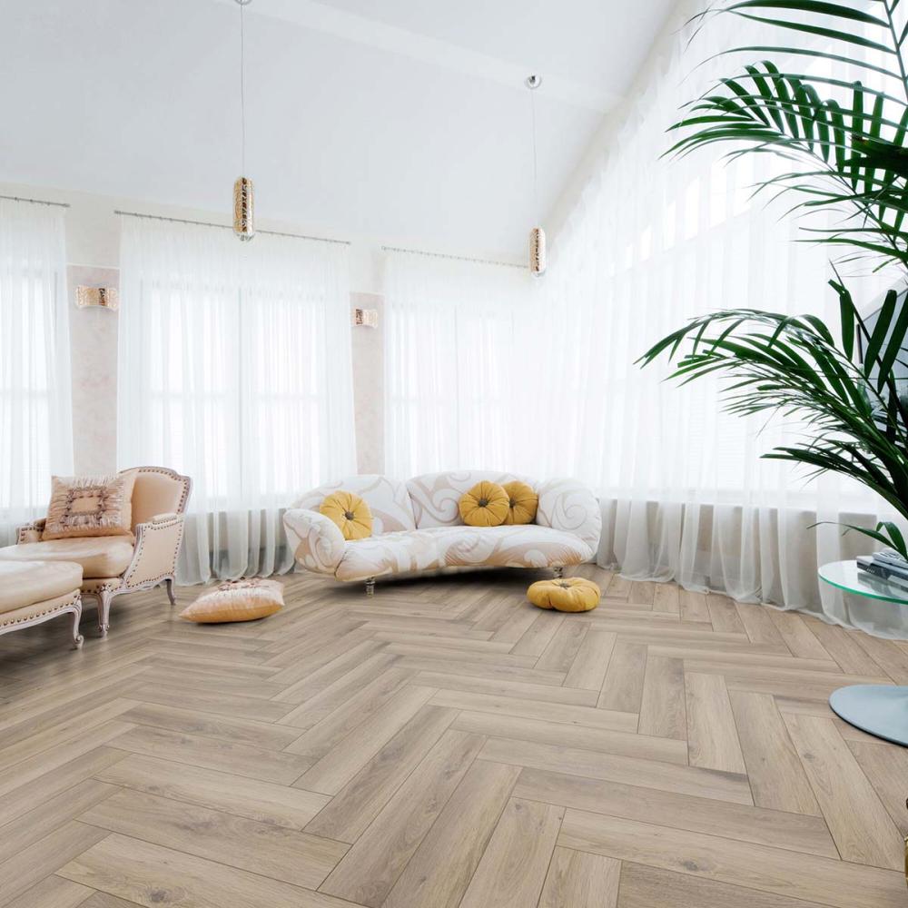 Tento vzor sa spája s drevenou podlahou. HERRINGBONE je úplne nová technika spájania laminátovej podlahy. Krásne vynikne vo všetkých priestoroch a prináša do interiéru stratenú eleganciu. Obohatí vaše priestory vzhľadom v štýle Art -Deco alebo Art - Nouveau. Laminátová podlaha s hrúbkou 8mm , oderuvzdornej triedy AC4/32 s V drážkou po celom obvode lamely a systémom spoja click.
